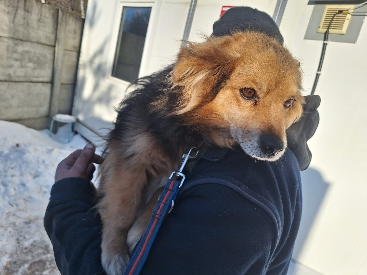 GRYZELDA przy pierwszym kontakcie z człowiekiem jest jeszcze nieco bojaźliwa, zwłaszcza podczas zakładania szelek. Z tygodnia na tydzień widać jednak wyraźne postępy — sunia coraz chętniej daje się „ubrać”, choć niewielki lęk nadal u niej występuje. Kolejne spacery z pewnością pomogą go całkowicie wyeliminować.